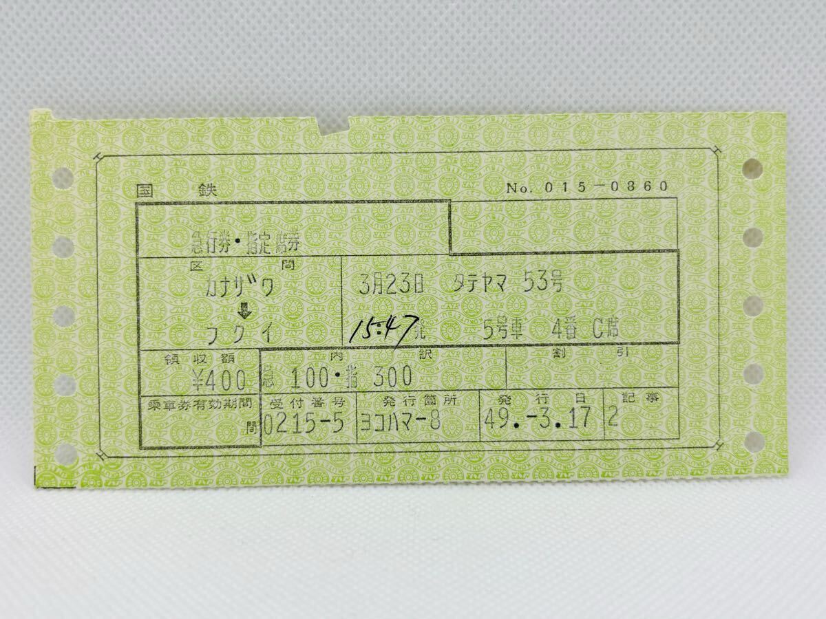 - 国鉄 マルス券 臨時急行立山53号 金沢→福井 455系 乗車券 急行券 指定席券 昭和レトロ 北陸本線