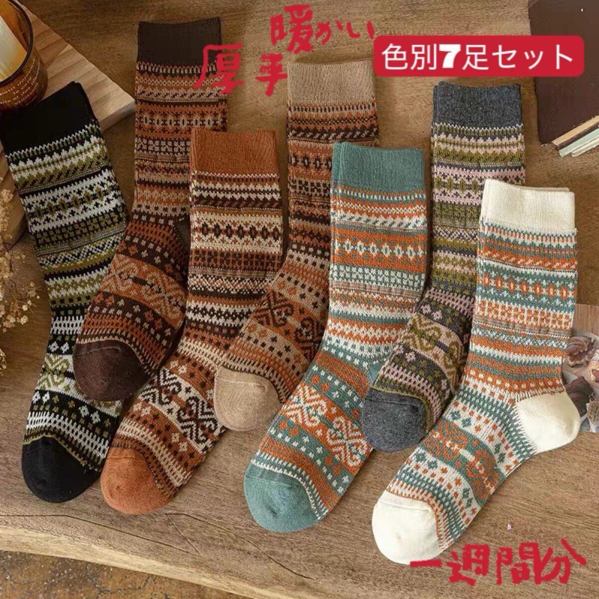 - 新品 北歐民族風 レディースソックス婦人7足セット クルー丈 山ガール冷え性対策 ウール混 まとめ売り 女性靴下