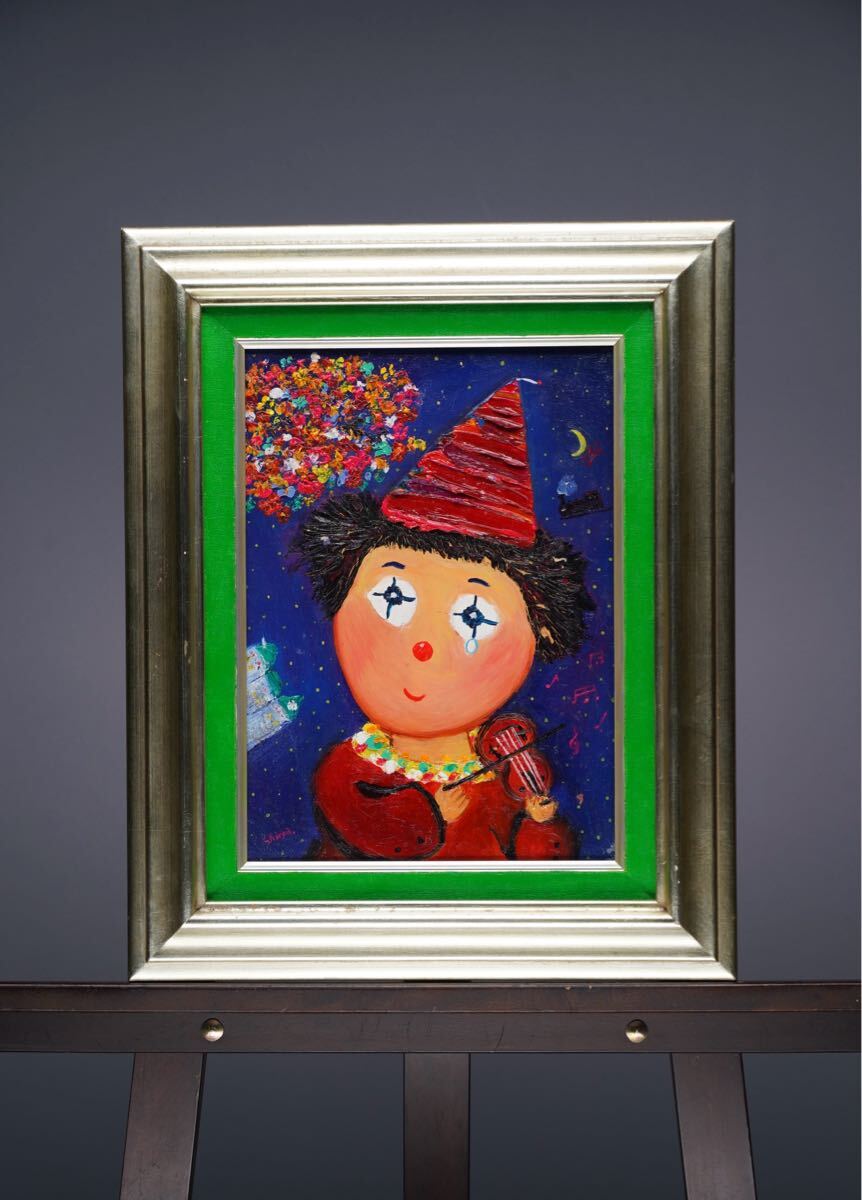 > 真作 清水新也「すてきな夢」油絵 F4号(24x33cm) サイン・裏書あり 愛情溢れる作品を描き続ける実力画家 カンヌ国際栄誉グランプリ ピエロ