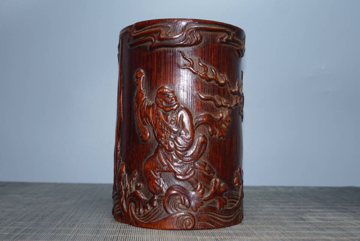 - ▽鴻▽ 竹材細密彫 降龍羅漢紋 筆筒 置物 古賞物 中国古玩 中国古美術