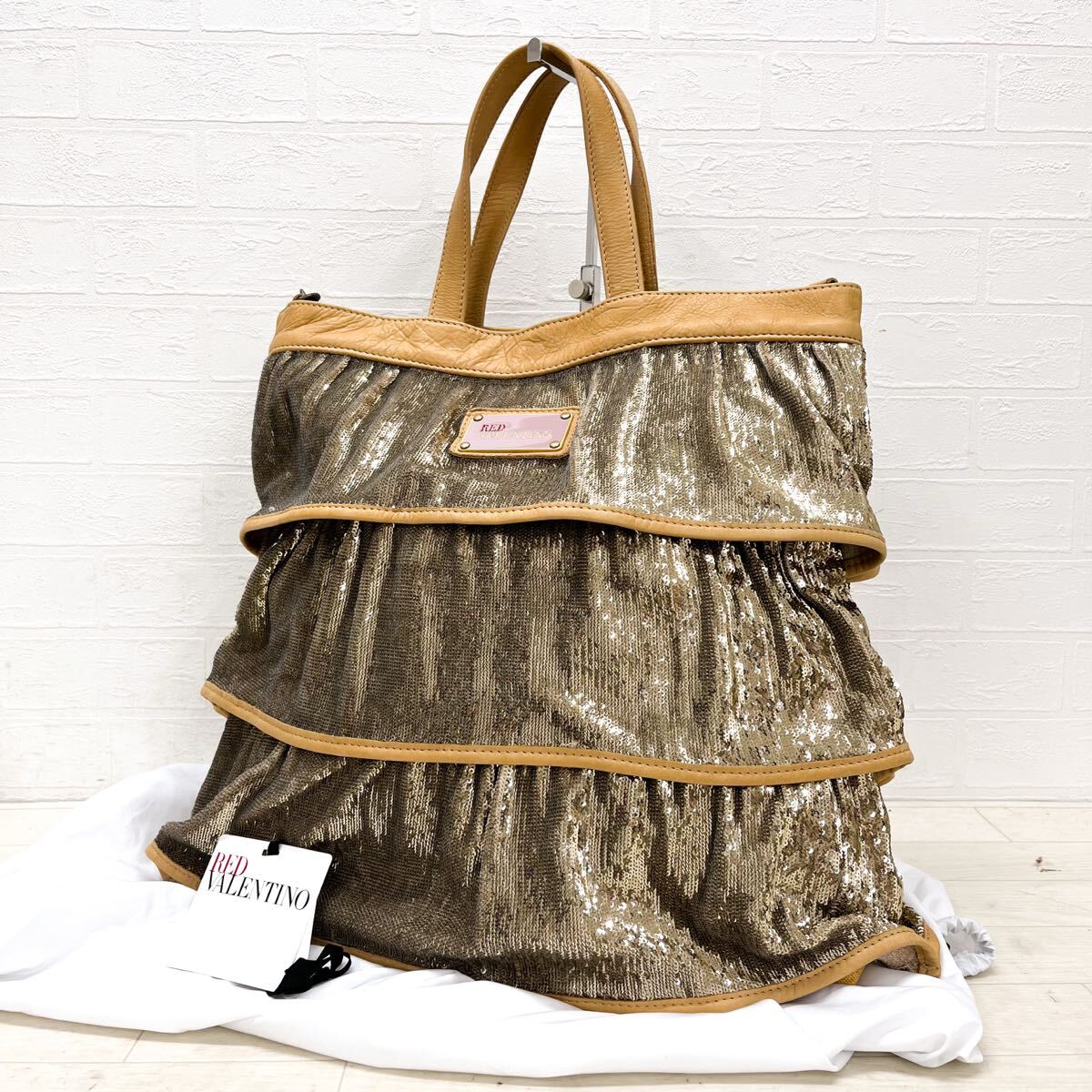 - K18★① RED VALENTINO レッドヴァレンティノ トートバッグ ショルダーバッグ フリル スパンコール ゴールド ベージュ レディース