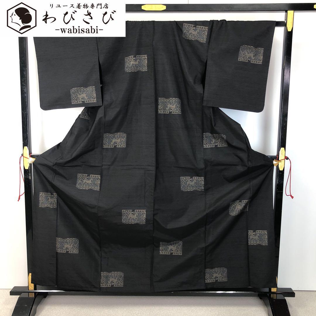 > 単衣 紬着物 四角に馬 騎士 墨色 K-4462 着物 きもの kimono 和服 和装 中古 リサイクル着物 【送料無料】