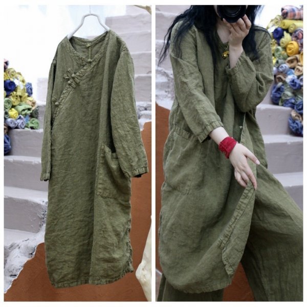- jm ワンピース チュニック 持ち出し斜め アンティーク風 ロマンファッション ゆったり 麻100% グリーン