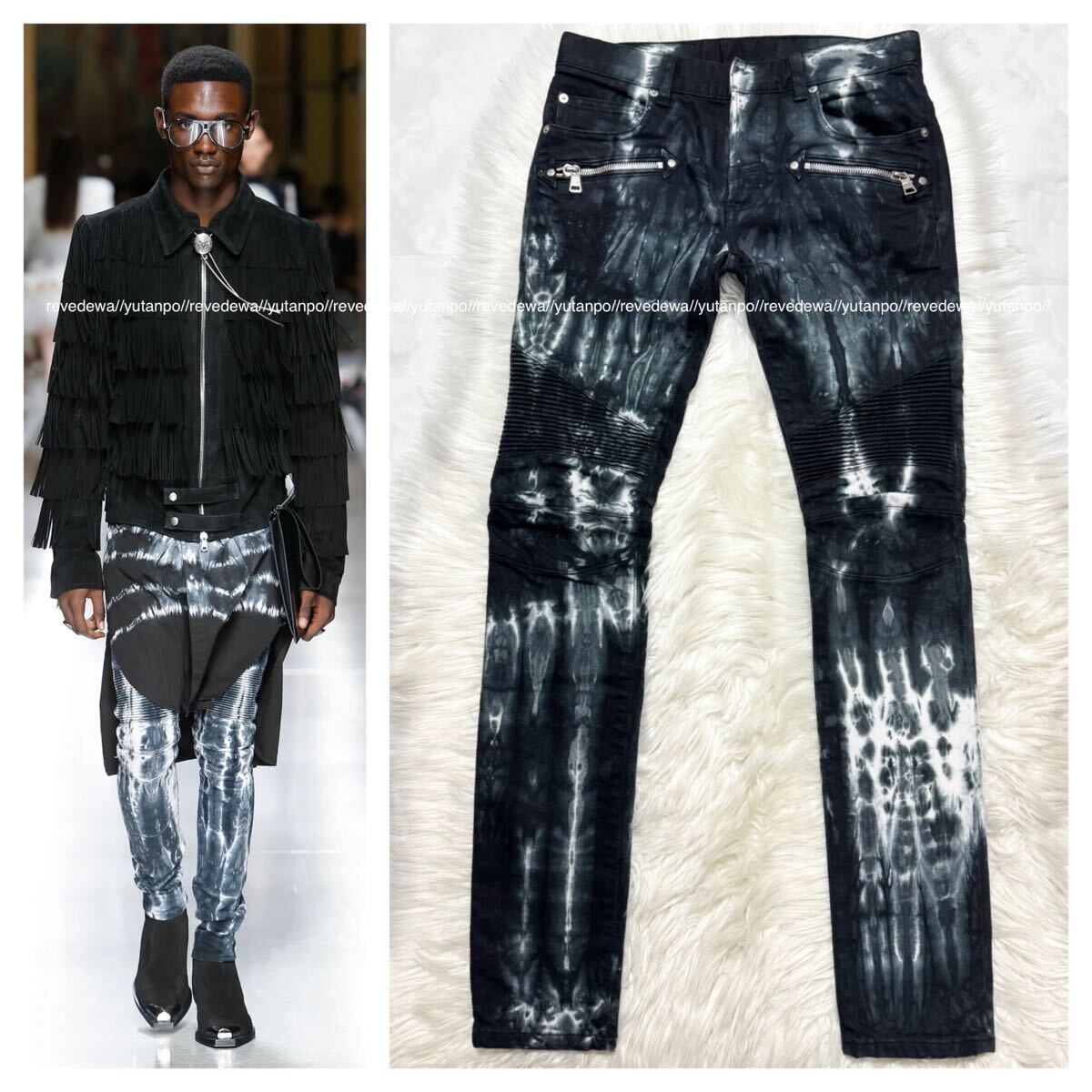 > 本物 美品 ランウェイ バルマンオム レザーパッチ スケルトン ブリーチ バイカー デニムパンツ ジーンズ 28 黒 緑 BALMAIN HOMME