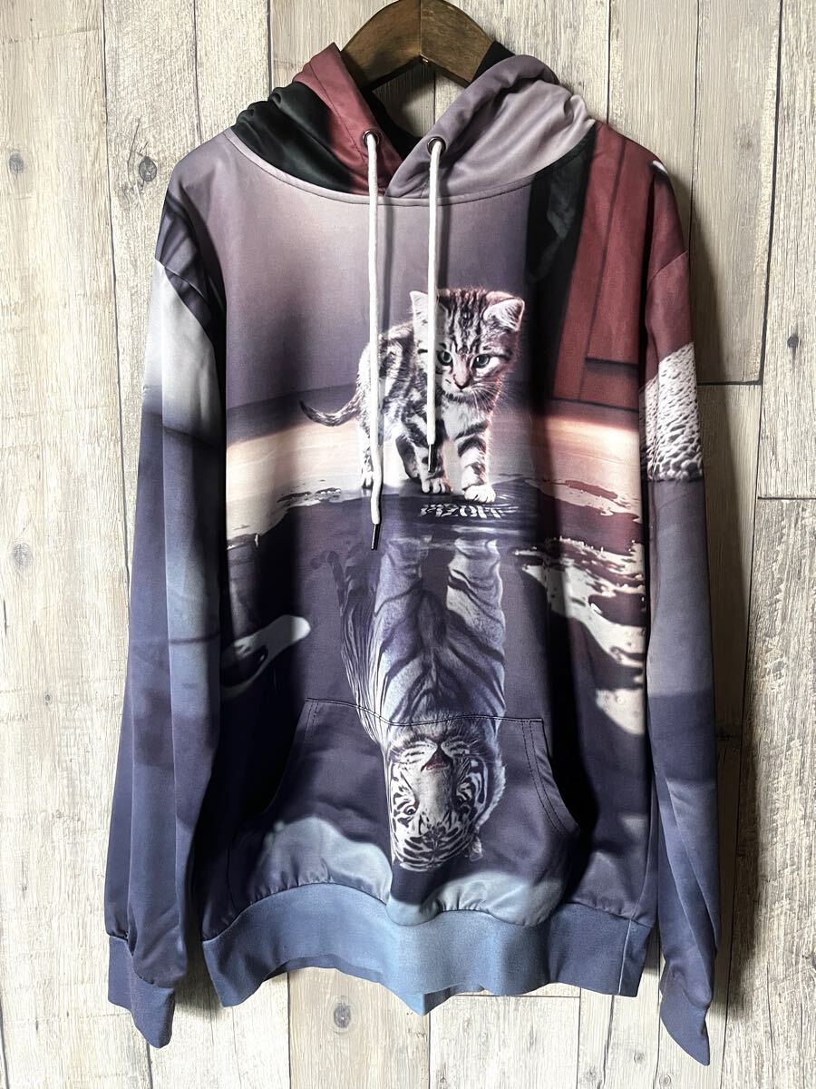 > ■個性派デザイン■ 夢見る子猫 プルオーバーパーカー フーディー ネコ ホワイトタイガー アメリカンショートヘアー 総柄 プリント