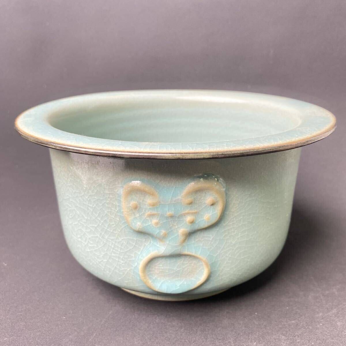 - 中国古玩 古い盆栽鉢 旧家 中国古美術 骨董 茶器 汝窯 青磁 花口 鉢 水指 水入 茶道具 時代物 南宋茶こぼし 建水 南宋