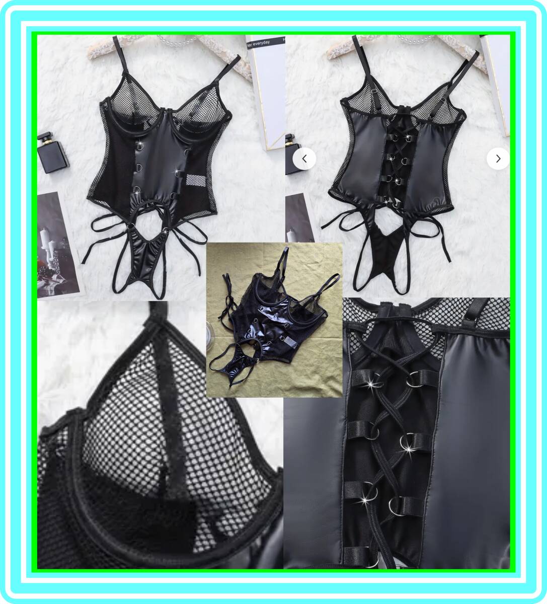 - ♥超素敵★ボディスーツ★アンダーワイヤー★フェイクレザー&メッシュネット★柔らか素材★クロッチレス♥P160W