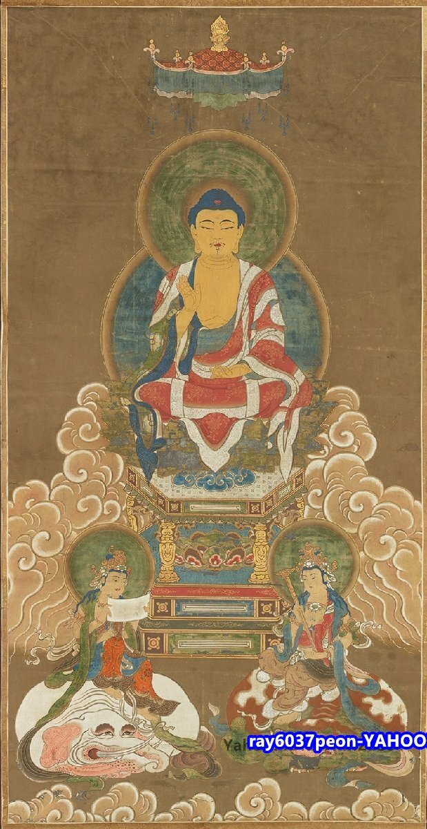- 日本 釈迦三尊像図 仏像 阿弥陀仏 西方三聖 華厳三聖像 文殊 普賢 縦幅 釈迦三尊 絹布 絹本 中堂画 掛け物 未表装