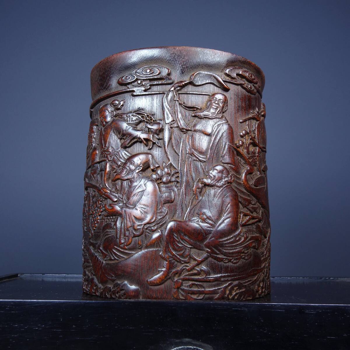 - ▽鴻▽ 竹材細密彫 八仙過海紋 筆筒 置物 古賞物 中国古玩 中国古美術