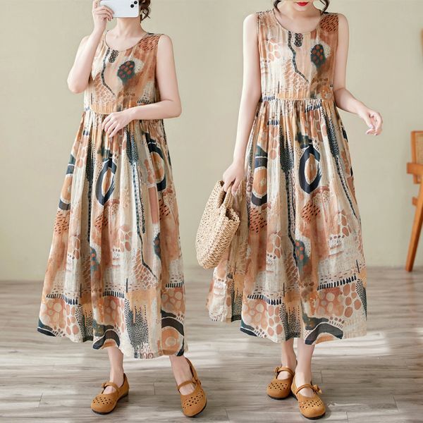 > 新入荷*カジュアル ワンピース プリント柄 着痩せ 着心地良い 通勤 可愛い ロングワンピース 大きいサイズ 花柄 ノースリーブ ワンピース*