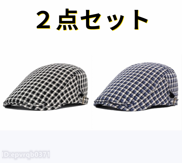 - 2点セット ハンチング キャスケット チェック柄 メンズキャップ 紳士 帽子 ゴルフキャップ 日よけ アウトドア フリーサイズ 黒/青