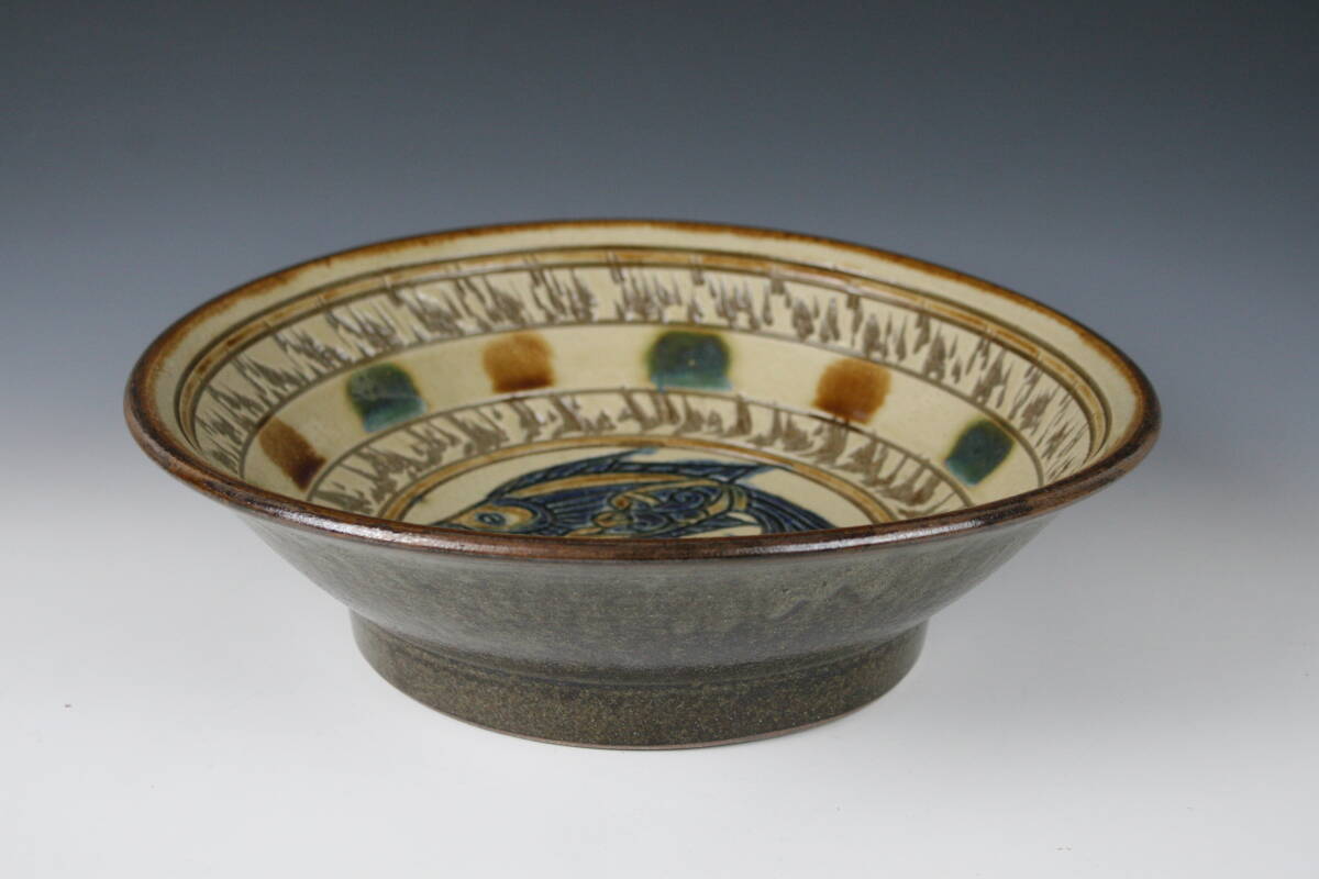 - 琉球壺屋焼 登り窯 金城裕三 作 三彩飛鉋魚文尺皿(一枚焼)