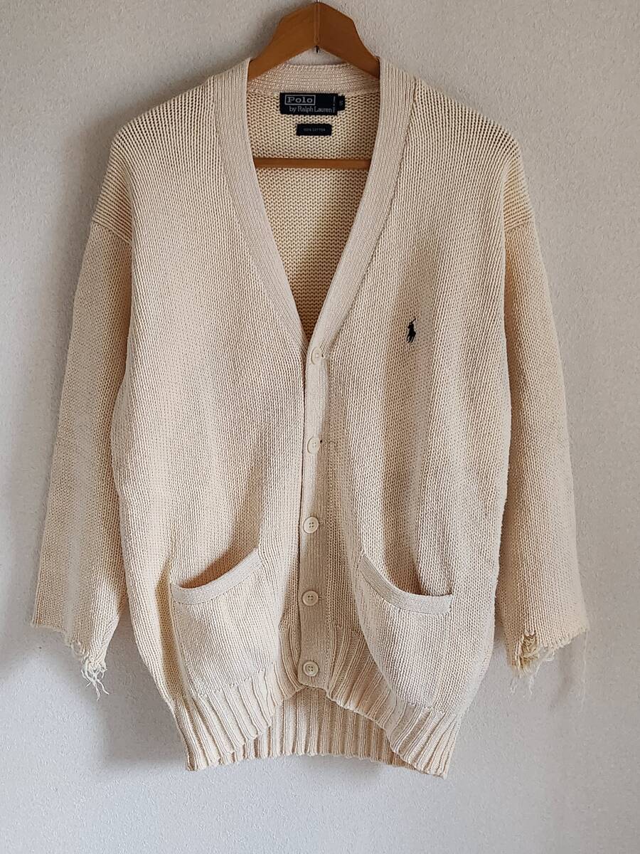 > PolobyRalphLaurenコットンニットカーディガン袖カットオフ白オフホワイト古着90s00sボロ