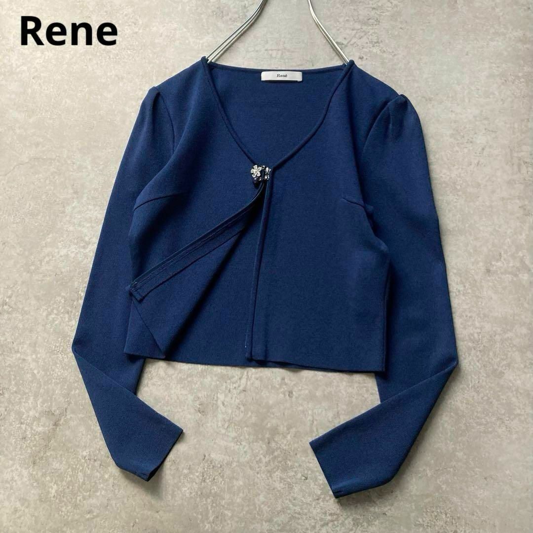 - ルネ 長袖ニットカーディガン ジルコニアパールスライダー Wファスナー ブルー 日本製 36サイズ Rene