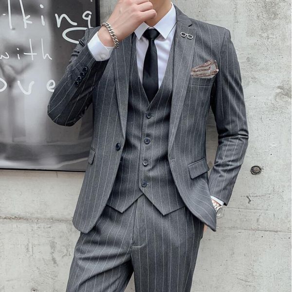 > 人気推薦 / メンズスーツ スリーピース ビジネススーツ 3ピーススーツ 新品 フォーマルスーツ ボーダー柄 洗える 通勤 結婚式/ダークグレー