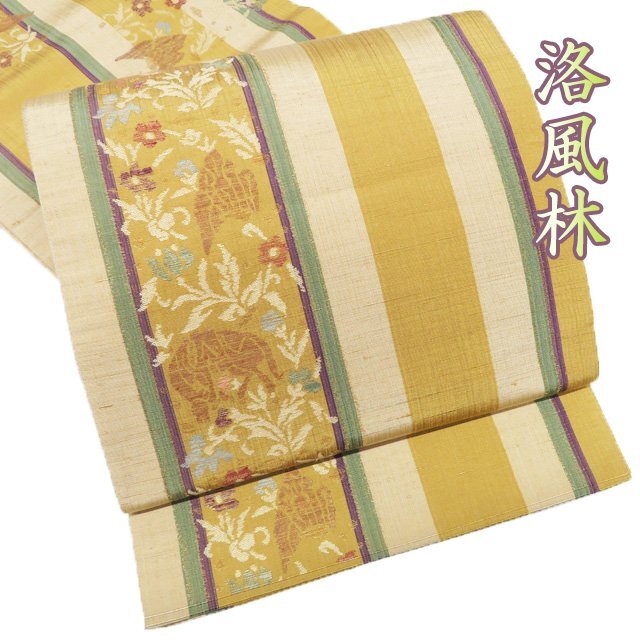 > 袋帯 中古 リサイクル 正絹 紬地 カジュアル 仕立て上がり 六通 洛風林 動物文様 花模様 箔糸 黄朽葉色 多色 きもの北條 A1166-10