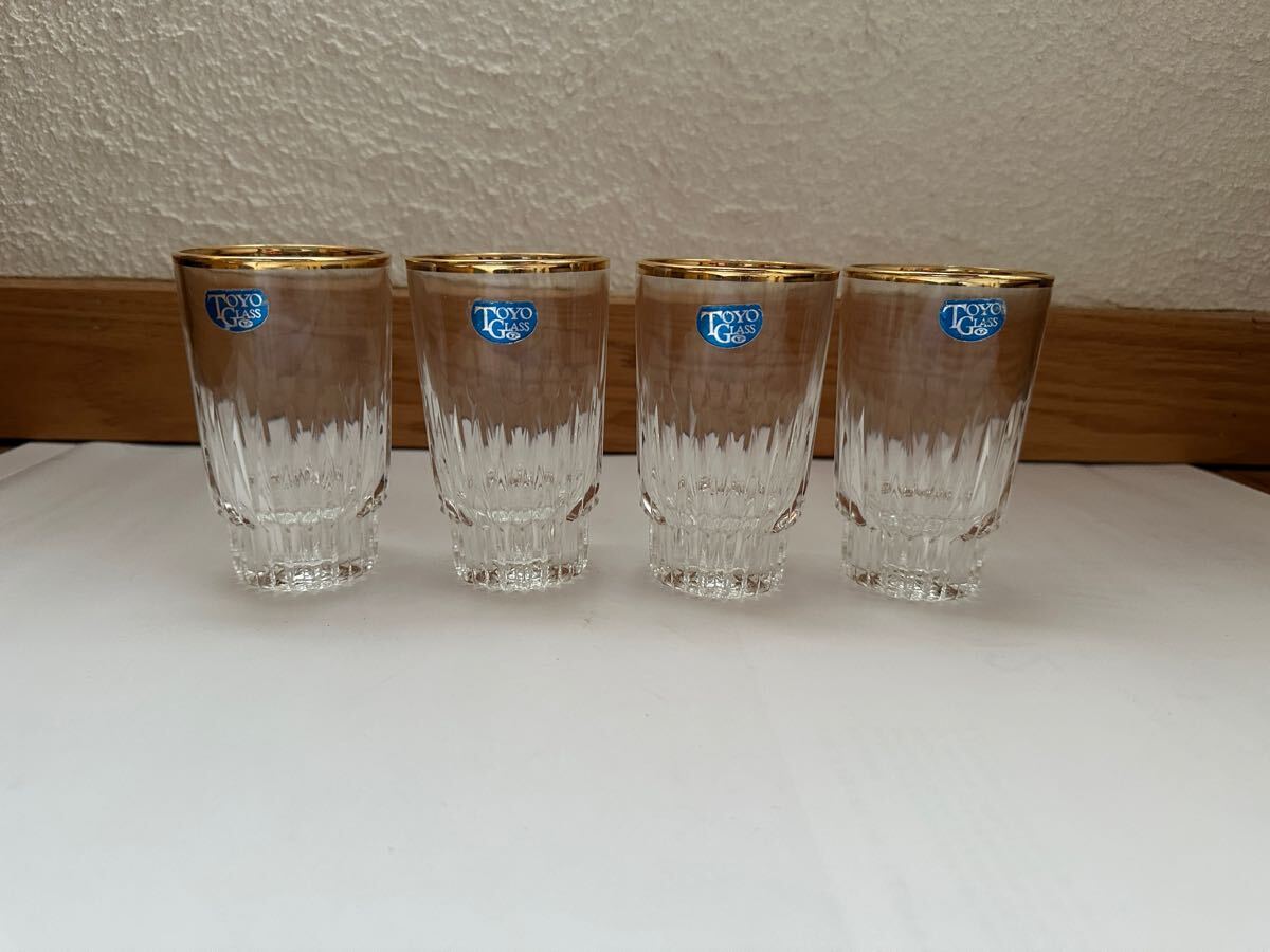 > 送料込み 古い 中古品 TOYO GLASS 金縁 モダンカット グラス 4個 セット 、 タンブラー 昭和 レトロ ポップ ビンテージ 東洋 佐々木 ガラス