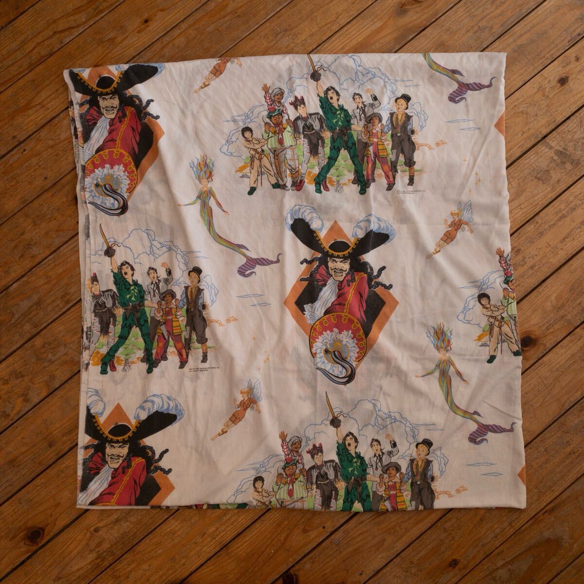 - USAヴィンテージ ベッドシーツ ピーターパン リメイク生地 素材 イラスト ディズニー フック船長 フラットシーツ アメリカ仕入 B2441