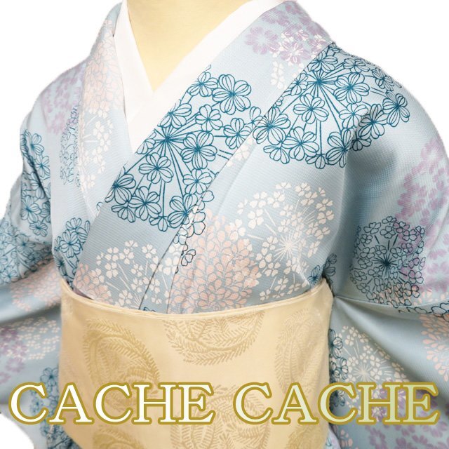 > 特選 小紋 着物 未使用 正絹 袷 CACHE CACHE カシュカシュ 花模様 反端付き 水色 多色 身丈161cm 裄69cm M きもの北條 A1169-4