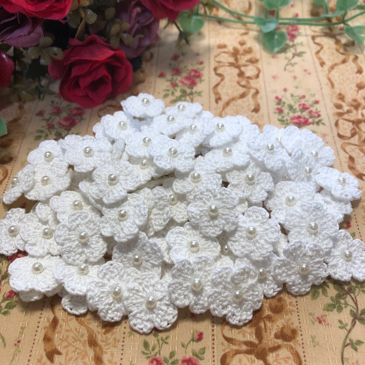 - (No.④)☆ハンドメイド☆可愛いお花(^^)100枚【ホワイト】パールビーズ付き モチーフ パーツ等に