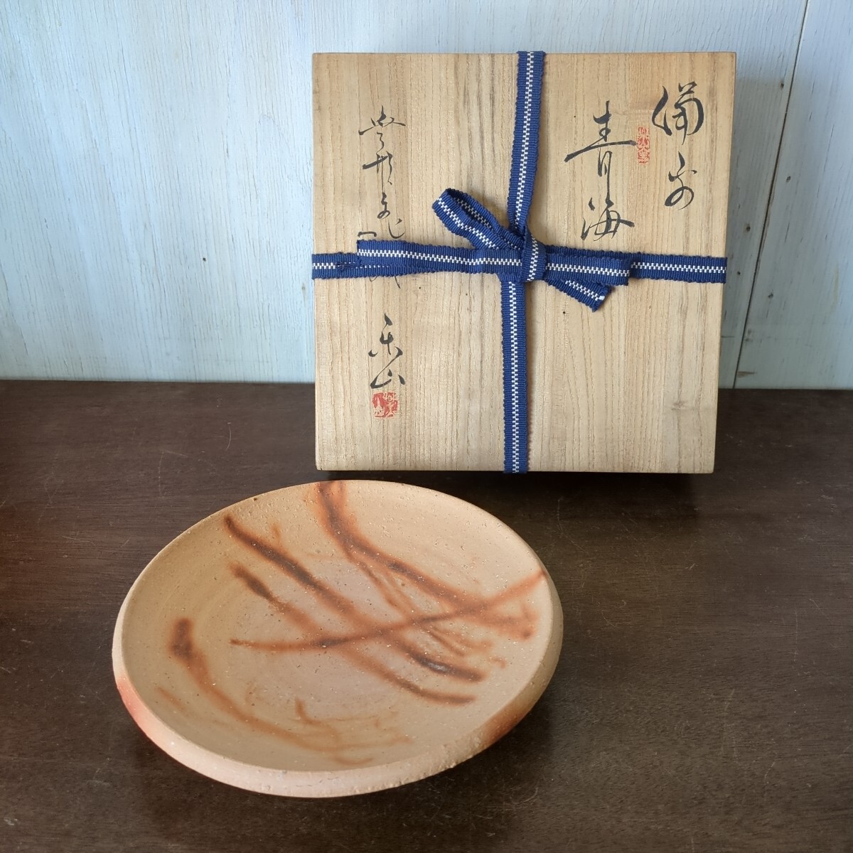 - 備前焼 青海 藤原楽山 緋襷 皿 共箱 共布 無形文化財 和食器