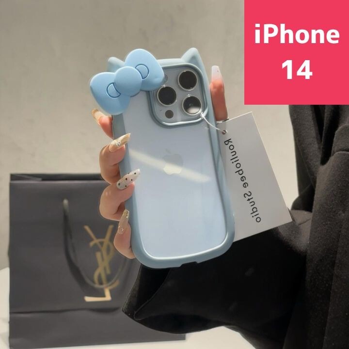 - iPhone14 ケース カバー 猫耳 リボン かわいい 韓国 ブルー 人気