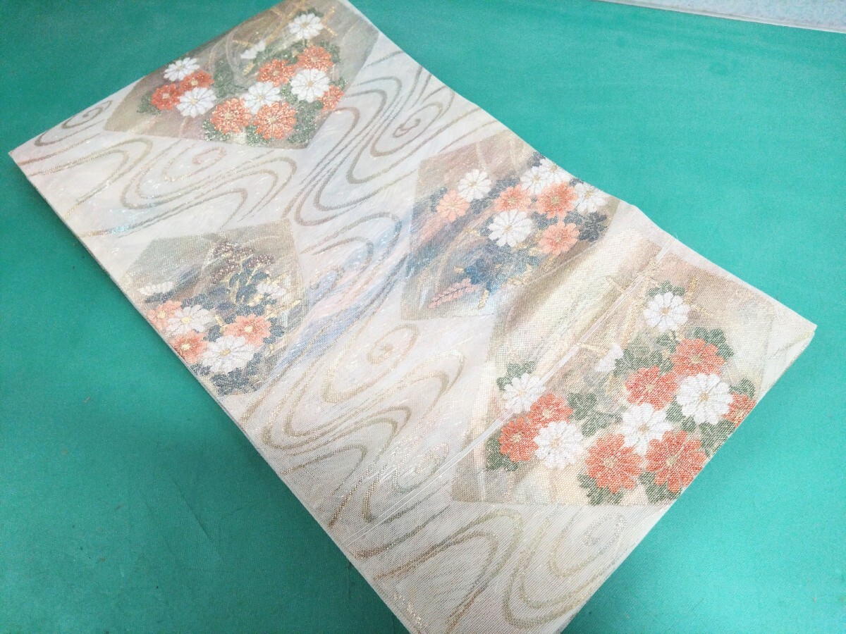 - ● 71 とても美しく 素敵な 夏帯 ライトベージュ 角度によって キラキラ輝く 玉虫色 流水 花 柄 金彩 水色 グリーン オレンジ 可愛い 帯 ③