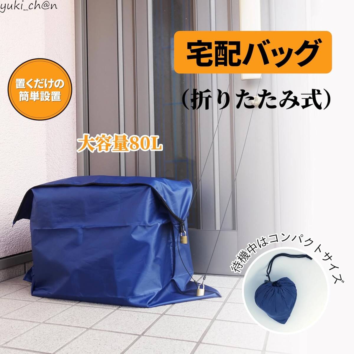 - 宅配バッグ 折りたたみ式 80L 大容量 ネイビー 置き配ボックス ナイロン 撥水加工 防犯対策 玄関収納 説明書付き 吊り下げ常設