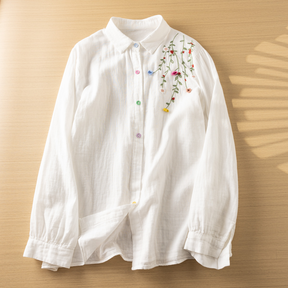 - 人気品推薦花の刺 ダブルガーゼ ワイシャツ チュニック オシャレ フリーサイズ ナチュラル 綿100% コットン ホワイト