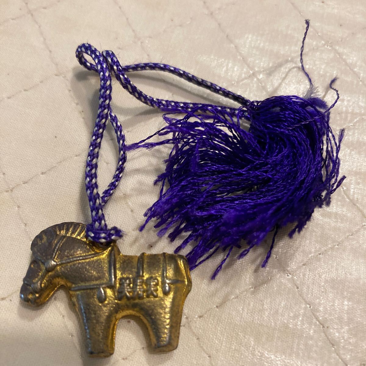 - 美寿実 1978 午年 干支 根付け ノベルティ 馬 ゴールドカラー 金属 紐 房付き 昭和レトロ