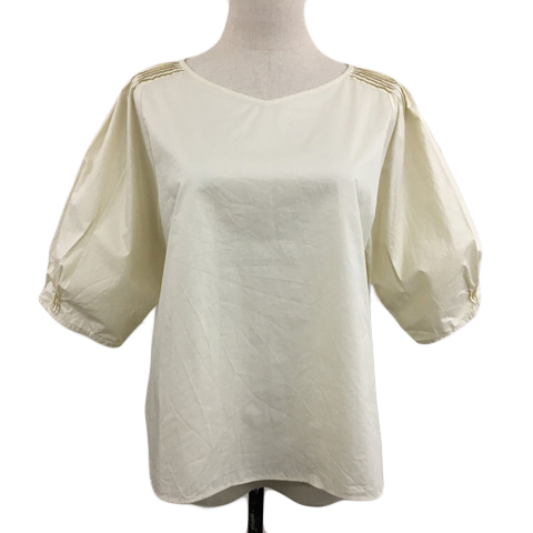 > ヒューマンウーマン HUMAN WOMAN ブラウス カットソー プルオーバー Vネック タック 無地 七分袖 M 黄 ベージュ イエロー レディース