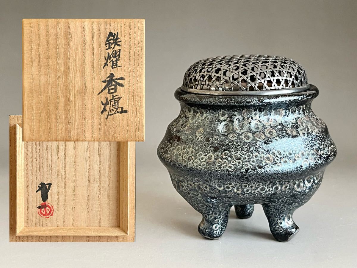 - 人間国宝 清水卯一 鉄燿 香炉 純銀火屋45g 三足 茶道具