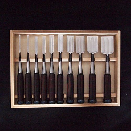 - ■播州三木職人 木成追入鑿10本組 黒檀柄三枚裏 桐箱入 鑿 セット