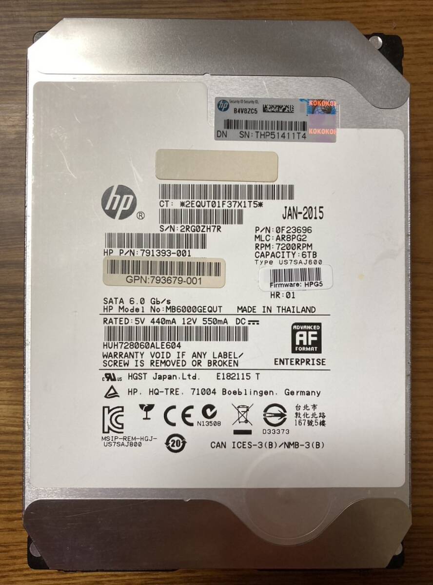 > 【使用時間・少】日立 Hitachi/HGST Ultrastar He8 HUH728060ALE604 3.5インチ HDD 6TB(hpOEMラベル/使用時間:1010時間未満)