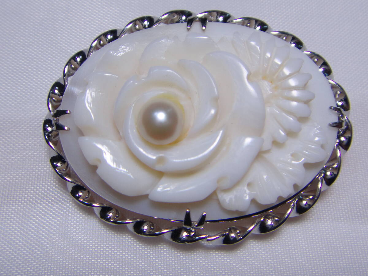 - 帯留め アコヤ真珠 本真珠 本真珠×貝細工 ツヤテリ玉 SILVER刻印 良品 花彫りデザイン ヴィンテージ Y555