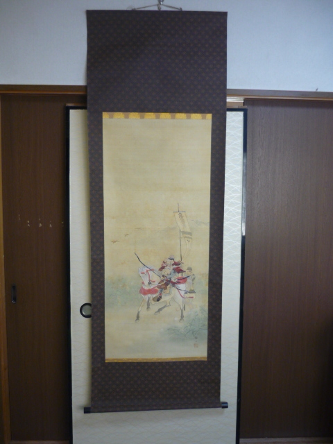 - 【模写】 掛軸 椿櫻湖 武者絵 絹本 大きさ全体約190x64cm 絹本部分約115x50cm