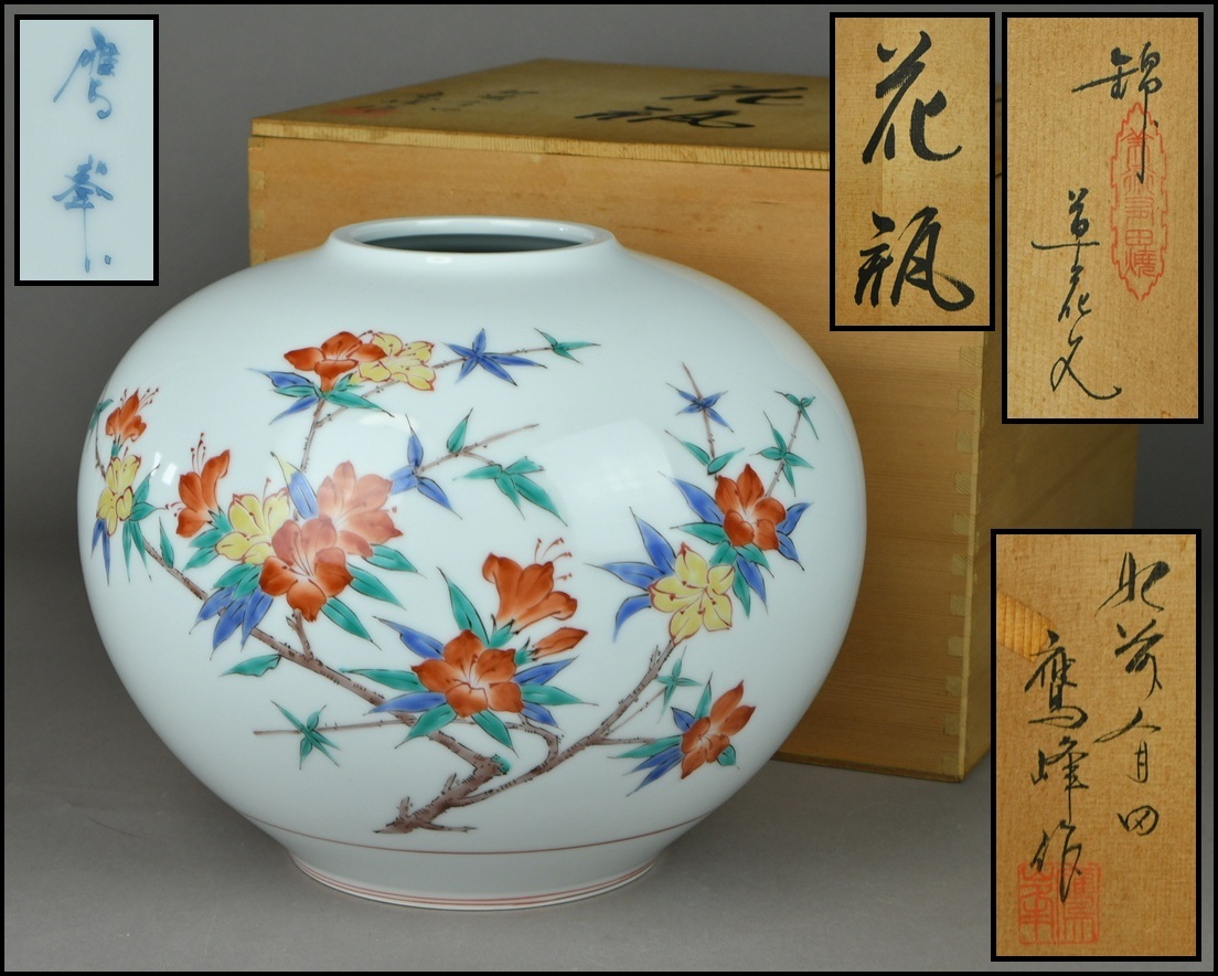 > 肥前有田 絵付師【鷹巣照久(鷹峯)】錦 草花文 花瓶 飾壷 花器 共箱 美術品 D253-8