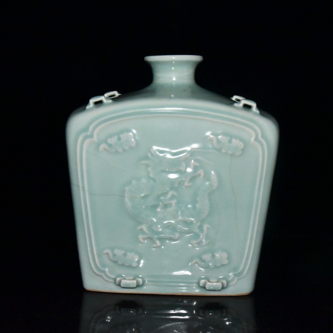 - 【超珍館蔵】宋 古陶瓷品 龍泉釉 開片 龍紋 扁瓶 置物 古賞物 古美術品 稀少珍蔵品