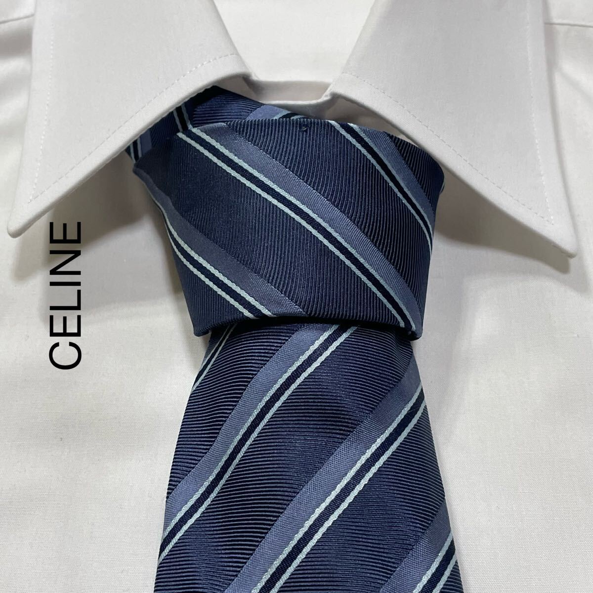 - CELINE セリーヌ ロゴ ストライプ シルク ネクタイ イタリア製 ネイビー ブルー TG1312