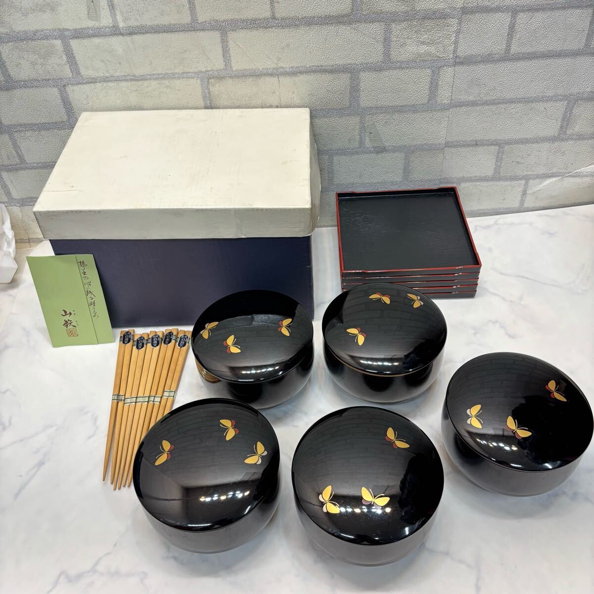 - 美品 1回のみ使用 蝶の都 盆付 新品箸付き 多用鉢 蓋付き お椀 盆付き