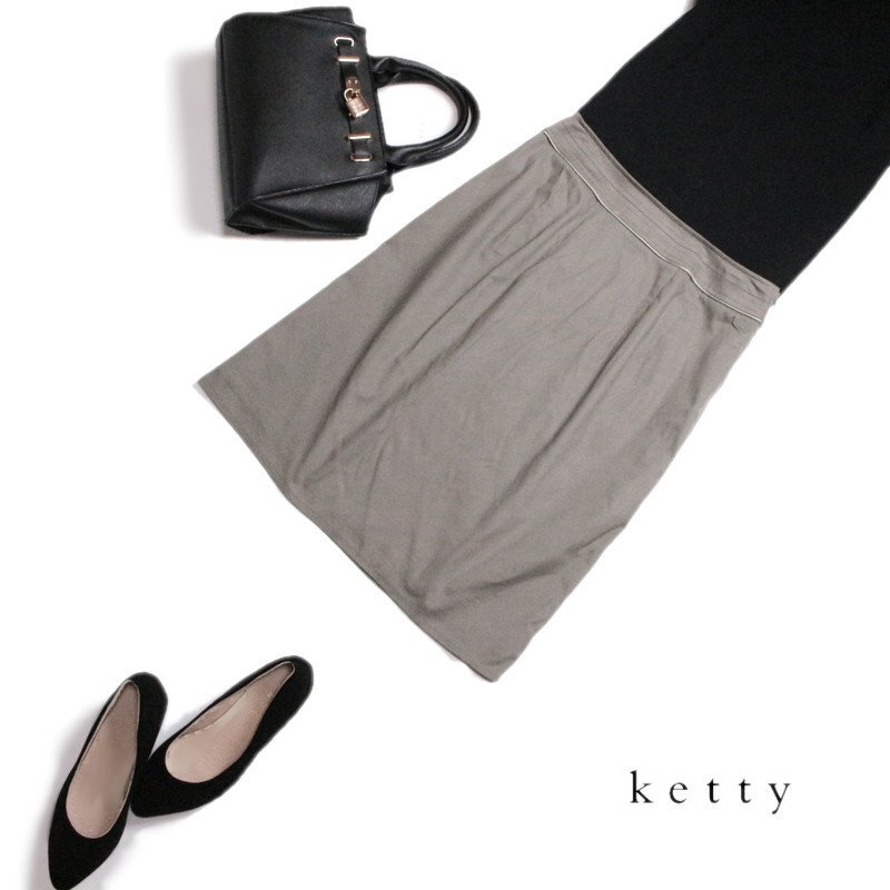 > 美品 春 夏 ketty ケティ 定番 ほんのり艶 ストレッチ ジャージ― コットン スーツ タイトスカート 2 9号 カーキブラウン 淡色 膝下丈 通勤