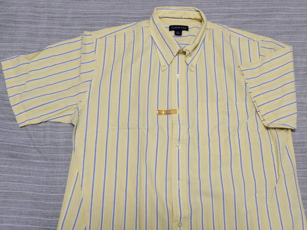 > 値下!!LAND‘S ENDランズエンド 半袖シアサッカー ボタンダウンシャツM 黄/青ストライプ USED