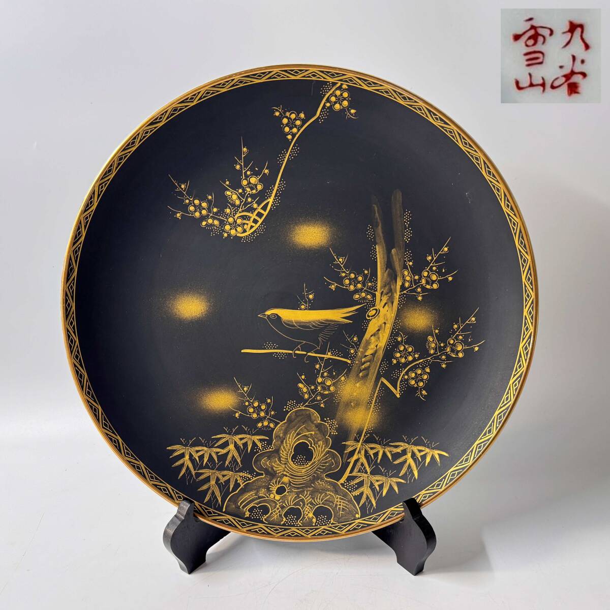 > 【62499Q】九谷焼 雪山作 大皿 飾り皿 金彩 漆黒 竹 梅 鶯 花鳥文 経年保管品 現状品