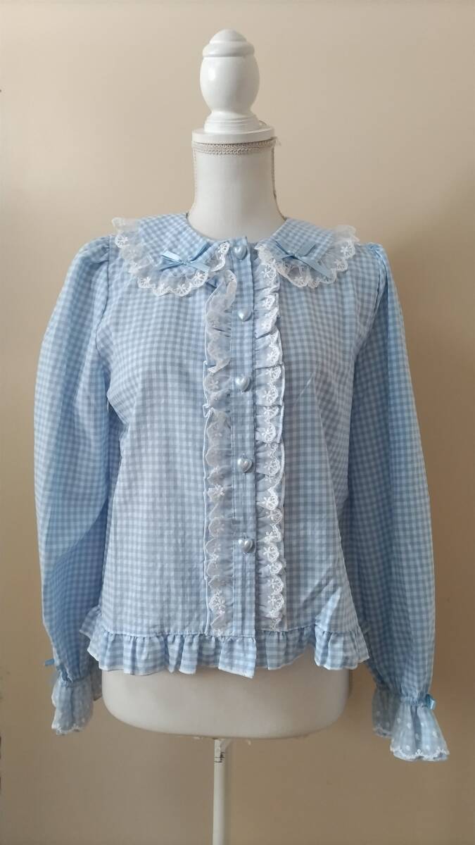 - No.2630_海外ロリィタ_未使用サックスギンガムチェックハートボタンブラウス