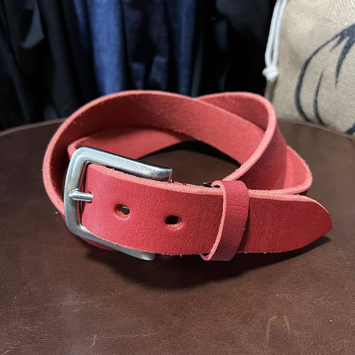 - 本革 栃木レザー レザーベルト レッド 赤 牛革 洗い加工 メンズ ベルト ヌメ革 35mm バックル メンズベルト