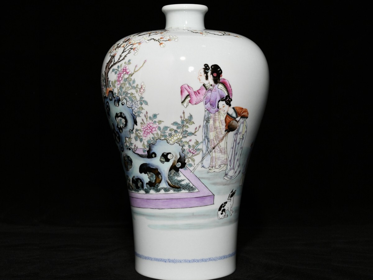 - 「清 雍正年製 陶磁器 粉彩仕女花卉紋梅瓶」染付 置物 擺件 古賞物 中国古美術 旧蔵出