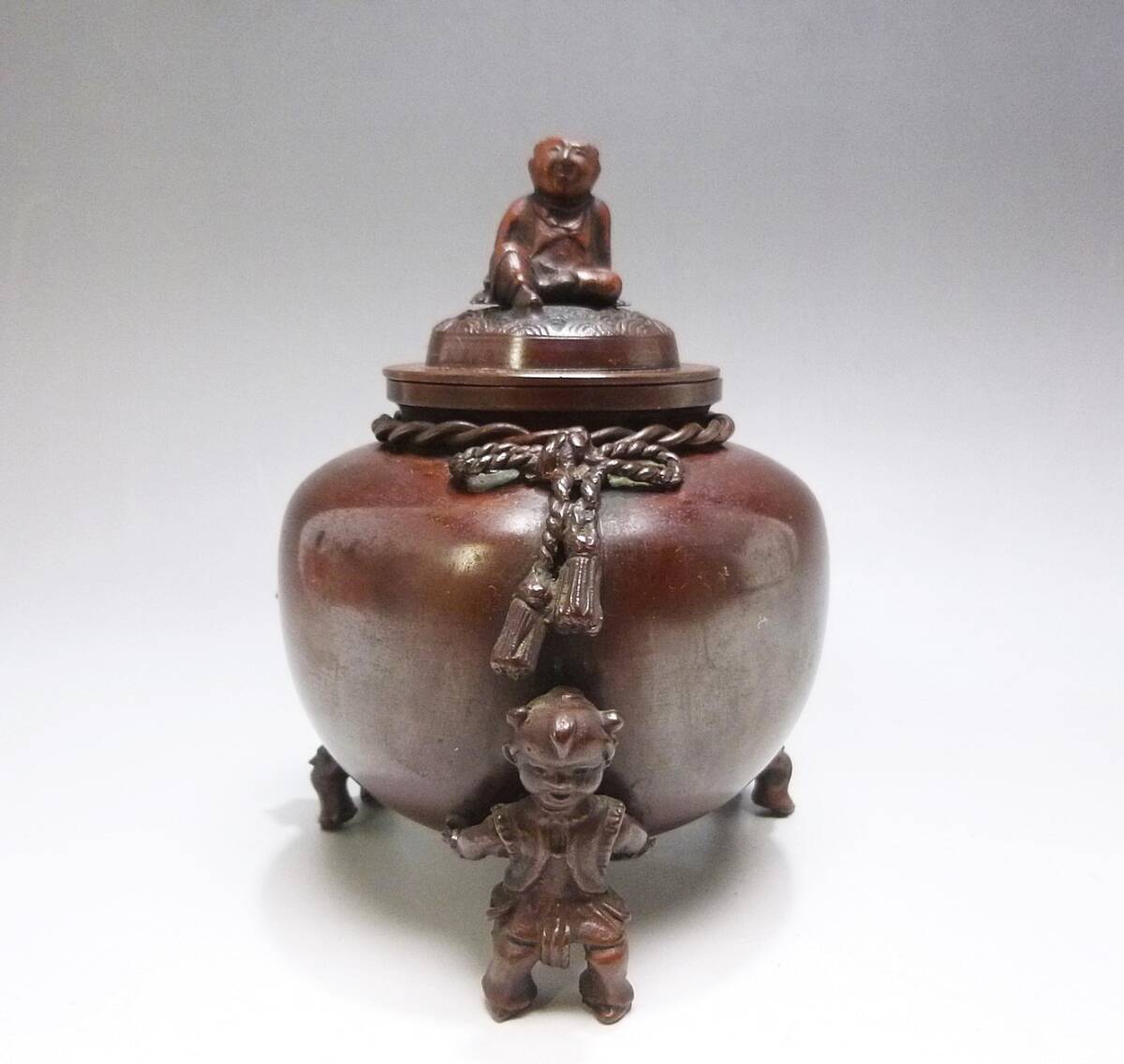 - 《ジャムルK》KKo0422-67◆白峰造 唐銅唐子三足香炉 銅製 香炉 香道具 合わせ箱 茶道具 金属工芸品 在銘