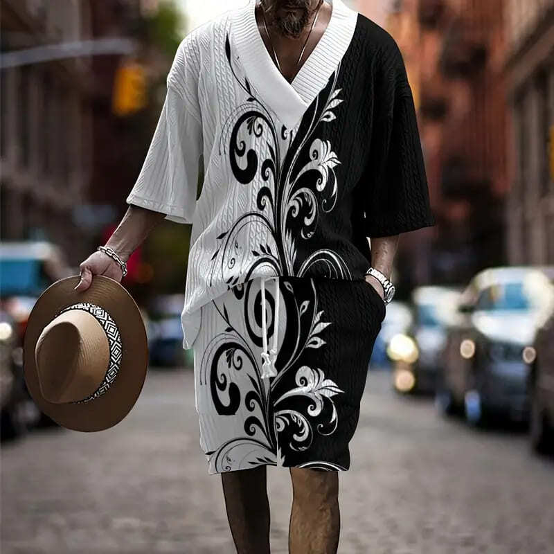 - ニット調 厚手生地 半袖セットアップ ジャージ 005 上下 白黒 ヤクザ ヤンキー オラオラ系 悪羅悪羅 ホスト 服 メンズ ファッション