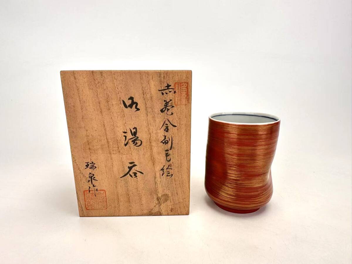 - F74★平安瑞泉造 清水焼 赤巻金刷毛絵湯のみ 湯 煎茶道具 茶道具 日本美術 共箱 在銘 現状品