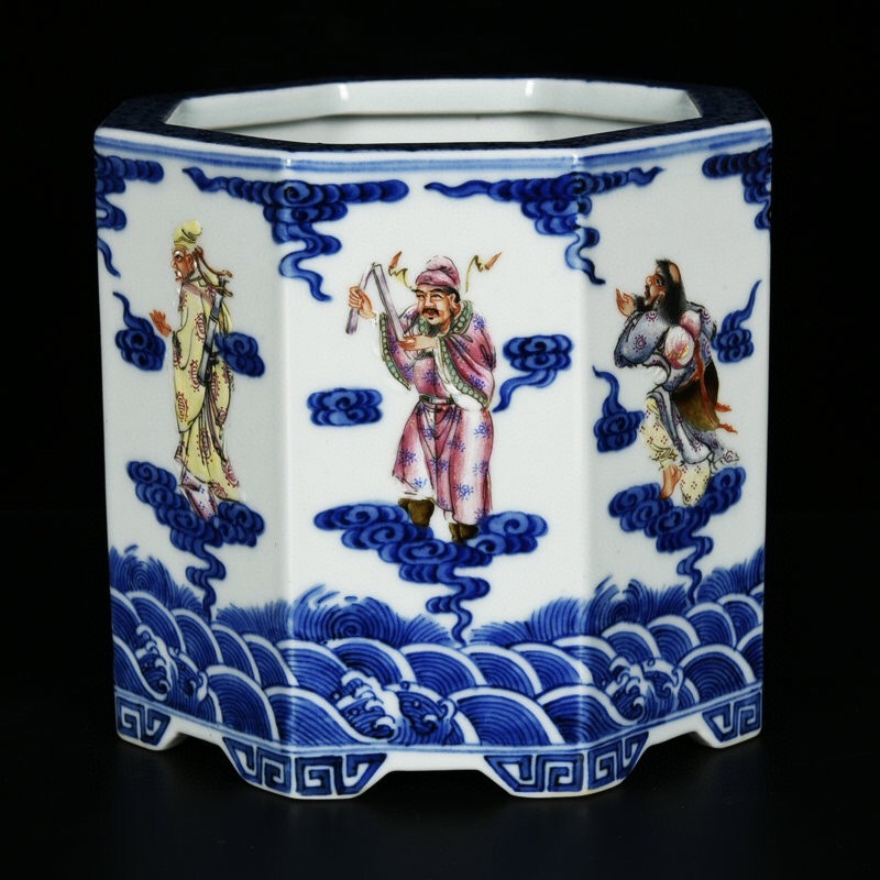 > 【仁】『清・乾隆年製款・古陶瓷品・青花・邊粉彩・八仙紋・八方筆筒』極細工 古賞物 中国古玩 古美術 古美味
